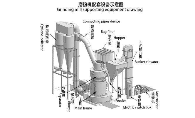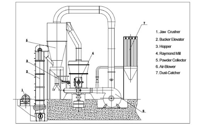 In the mainframe of raymond mill grinding machine, there are strong springs with pressure as high as1000-1500 kg equipped on the roller suspender. When Raymond Mill works, the roller rotates around the principal axis, and clings to ring under the effect of the strong spring and eccentricity. Its press is 1.2 times of Raymond mill under the same press condition, so the production is largely increased. When the materials are sent into the grinding chamber, they are brought to the space between the roller and ring and get grinded. Then the powder grinded will be blown into separator. The fine powder after departed with the air is discharged through the outlet as final product. The large-sized powder falls back for regrinding. The air will be back to the blower for repetition of the above process. The left air wil come to the bag filter to get cleaned. When the wear and tear between roller and the ring reaches certain degree, adjust the length of the strong spring,, so to keep the invariable pressure between the roller and the ring, to make sure the stable production and the fineness..